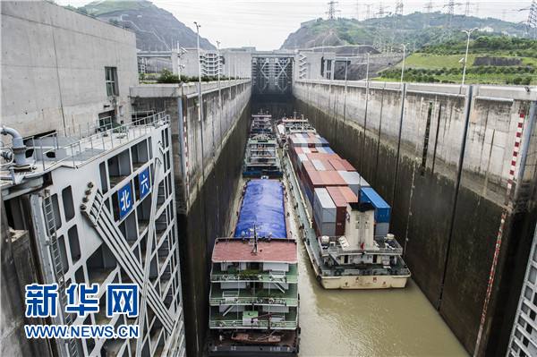 2015年6月22日,船舶通過三峽雙線五級船閘上行。當年5月,三峽船閘和葛洲壩船閘通過貨運量雙雙破千萬噸。新華社發(鄭家裕 攝)