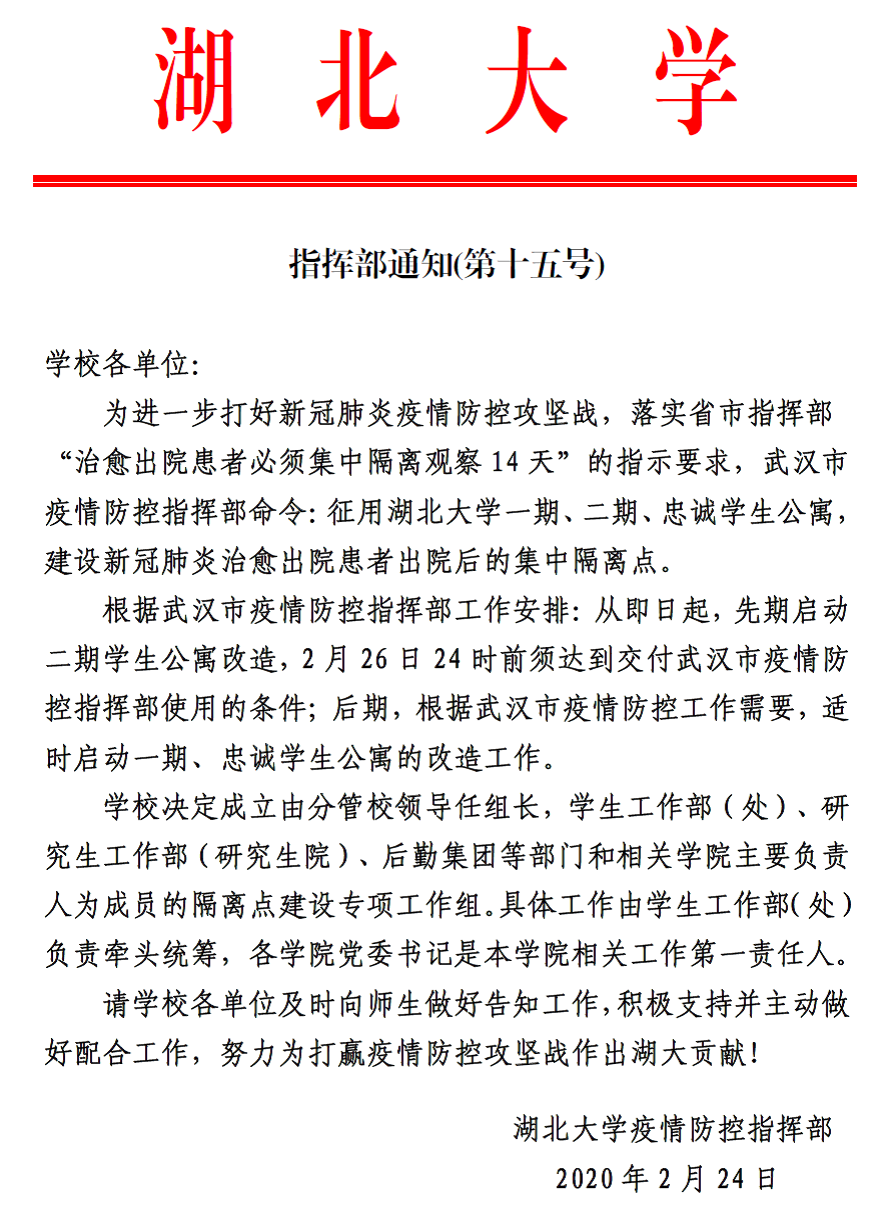 湖北大學(xué)疫情防控指揮部通知(第15號(hào))