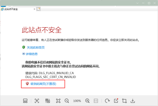 2、如瀏覽器提示“此站點不安全”,請選擇繼續訪問。
