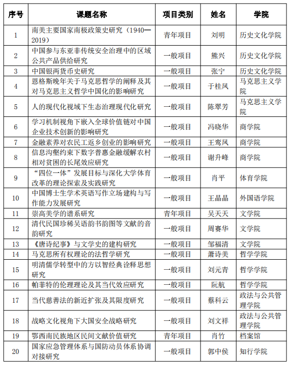 9月27日,全國哲學社會科學工作辦公室正式公布2020年度國家社科基金年度和青年項目立項名單,我校20個項目獲批立項,立項總數再創歷史新高。其中,一般項目17項,青年項目3項,總數居全國第58位(不含西部項目)、湖北省第6位。