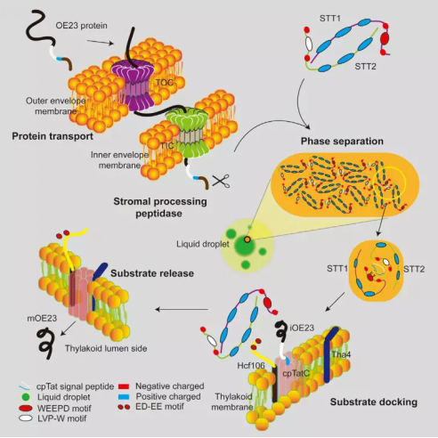 該研究發現了位于葉綠體基質的關鍵蛋白轉運分選因子STT1與STT2,闡明了雙精氨酸依賴轉運途徑的底物如何識別、分選以及如何轉運靶定到雙精氨酸依賴轉運途徑的分子機制。STT1與STT2蛋白都包含N端的IDR (intrinsically disordered region) 結構域與C端的ankyrin repeat結構域。STT1與STT2能夠依賴于ankyrin repeat結構域的相互作用形成一個橢圓球狀異源二聚體結構,而STT1與STT2的IDR區域分別含有保守的WEEPD基序與LVP-W基序,識別底物信號肽的雙精氨酸(RR)基序與疏水結構域(H domain)。研究表明底物結合激活STT復合物進一步的組裝相分離形成濃縮的液滴。STT-底物相分離液滴協助底物穿過葉綠體基質從而靶定到類囊體膜。而Hcf106能夠抑制STT的相分離從而釋放底物,完成底物的正確運輸與裝配。這種方式可能既能確保底物折疊,同時保持底物信號肽的活性便于被下游Tatc/Hcf106通道識別,阻礙STT-Hcf106結合會阻斷Tat底物的運輸,影響植物光合作用從而導致植物致死的表型。該研究首次發現了相分離調控葉綠體蛋白的運輸,從而調控葉綠體生成和光合作用。同時該研究強調了相分離調控蛋白運輸是在所有物種都存在的普遍機制。因此該研究同時拓展了相分離與蛋白運輸的研究領域,也為研究細胞是如何精確調控其各種生理活動拓展了思路(見圖2)。