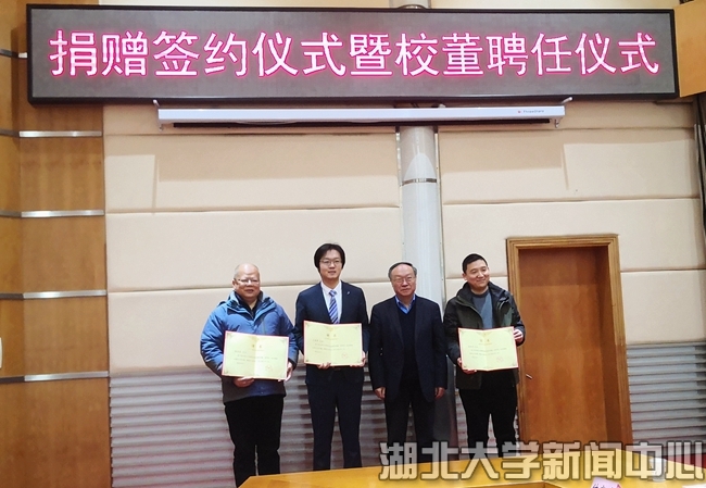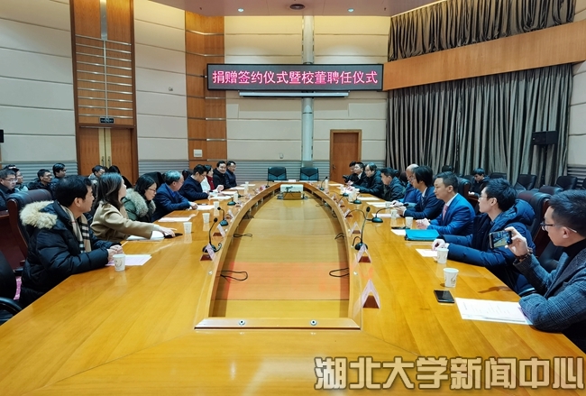 1月19日,湖北大學捐贈簽約儀式暨校董聘任儀式在會議中心舉行。美益添生物醫藥(武漢)有限公司、武漢賽維爾生物科技有限公司、江西萬谷種豬育種有限公司等三家企業共向學校捐贈2500萬元,支持生命科學學院科學研究,學校分別聘任三家企業負責人為2020年首批校董。捐贈儀式前,商學院兩位不愿透露姓名的愛心校友,也捐贈100萬元支持學校以及商學院建設發展。