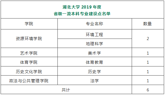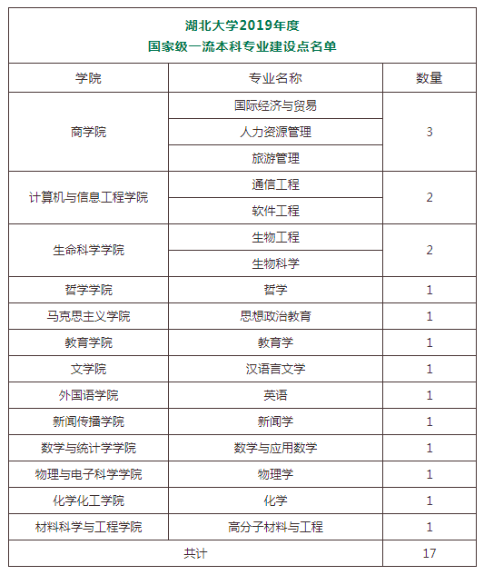 湖北大學入選國家級一流本科專業(yè)建設點的17個專業(yè)是:旅游管理、漢語言文學、數(shù)學與應用數(shù)學、通信工程、思想政治教育、國際經濟與貿易、英語、軟件工程、生物工程、人力資源管理、哲學、教育學、新聞學、物理學、化學、生物科學、高分子材料與工程;入選省級一流本科專業(yè)建設點的6個專業(yè)是:環(huán)境工程、地理科學、美術學、體育教育、歷史學、法學。