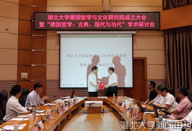 謝紅星和鄧曉芒教授共同為湖北大學(xué)德國(guó)哲學(xué)與文化研究院揭牌,謝紅星向鄧曉芒教授頒發(fā)院長(zhǎng)聘書。
